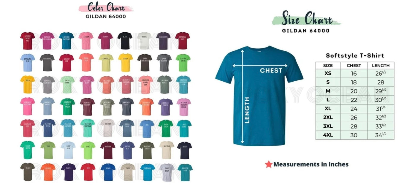 Short sleeve, long sleeve, crewneck, and hoodies are unisex fit. Brand will be Gildan, Tultex, next level, anvil or Jerzees depending on available stock.